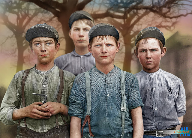 4 boys called "doffer boys" who were part of the Child Labor era in the US. The jobs entailed the removal (doffing) and replacement of thread bobbins when empty in a factory in Macom,GA. Colorized from a 1909 photo by Lewis Wickes Hine with some liberties on the background.